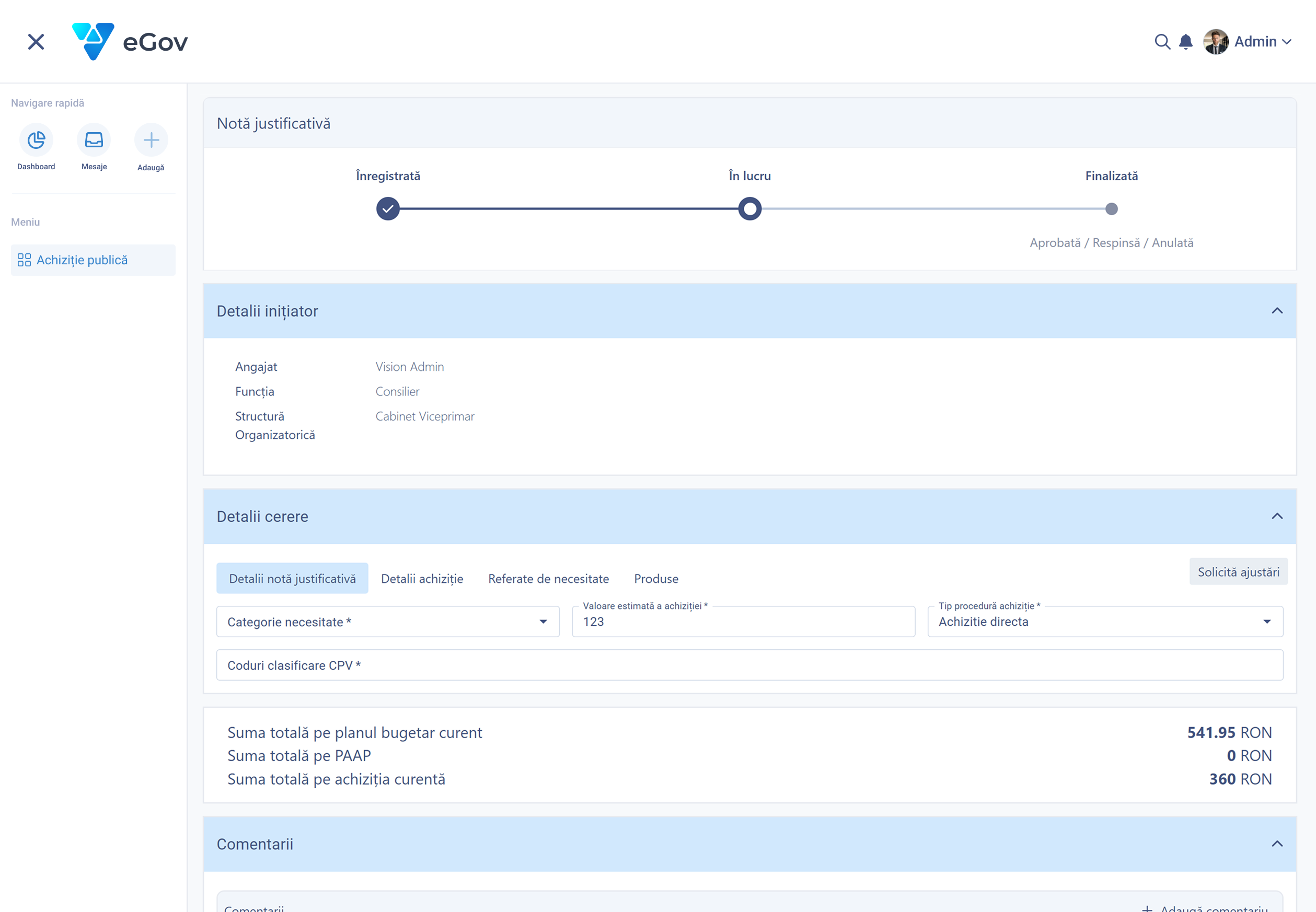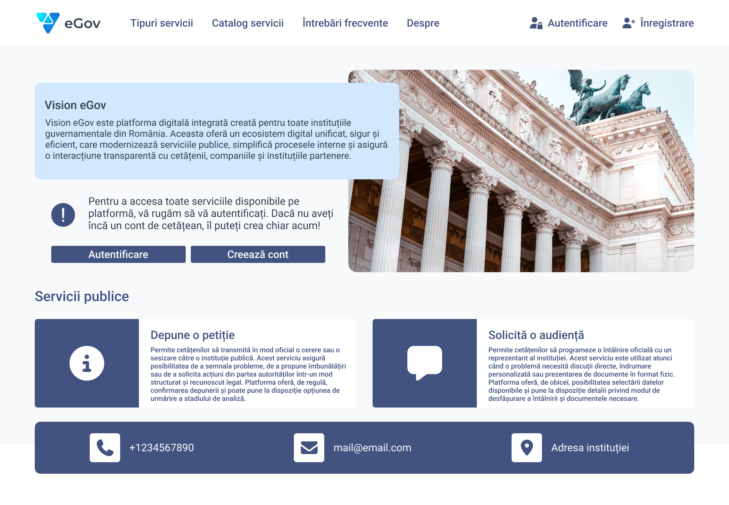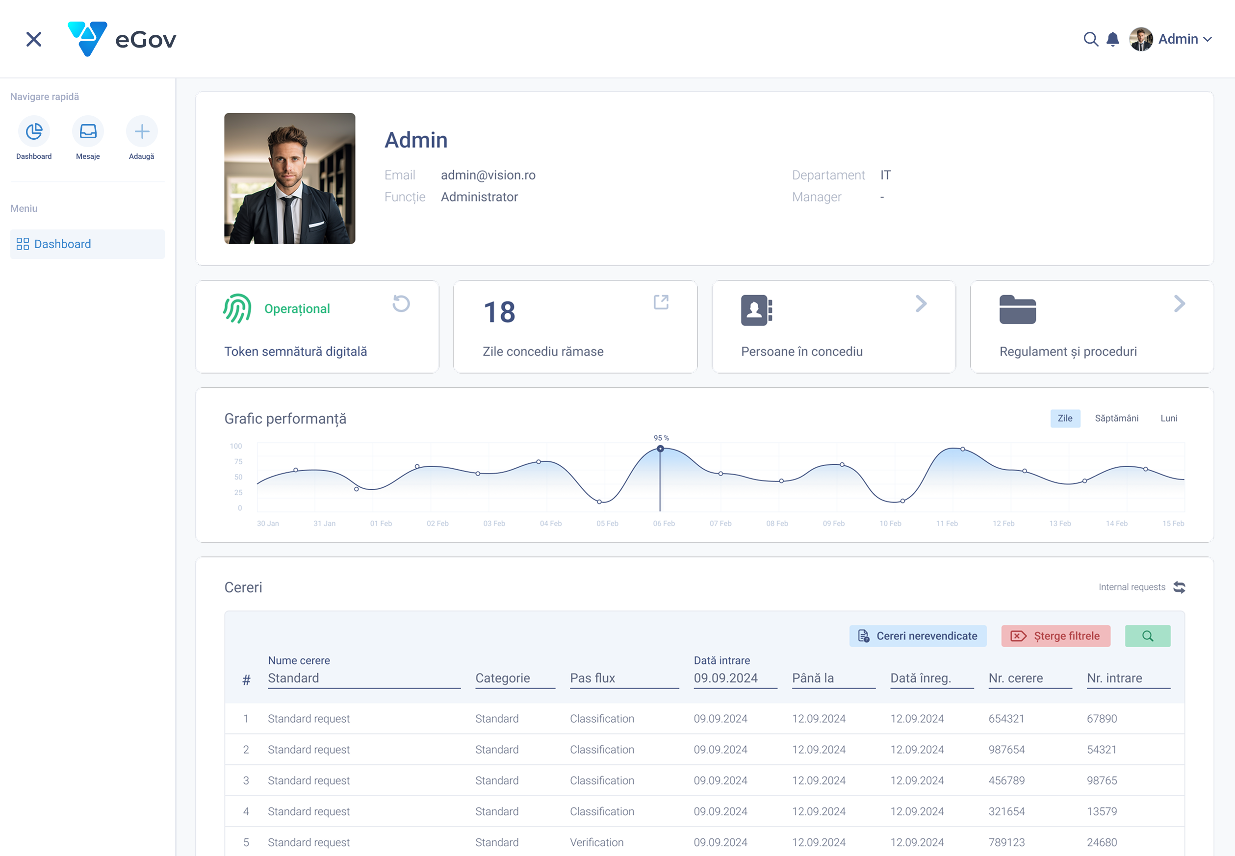 Vision eGov is the integrated digital platform designed for all Romanian government institutions. It provides a unified, secure and efficient digital ecosystem that modernizes public services, simplifies internal operations, and ensures transparent interaction with citizens, companies, and partner institutions.